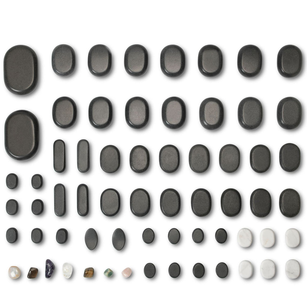 This set of 64 stones of different sizes is ideal for professional and private use. The stones are extremely suitable for hot stone treatment of approximately 60 to 120 minutes. The set offers many possibilities due to the many different types of stones, such as marble stones (cold stones), basalt stones (hot stones) and chakra stones.