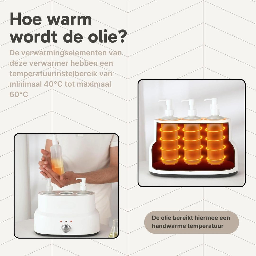 Note: The heating elements of this warmer reach a maximum of 60°C, but this does not mean that the oil will be heated to this temperature. If you want the oil to be truly warm, this warmer may not be the best solution. However, if you’re looking for a method to take the chill off the oil, this warmer is ideal.