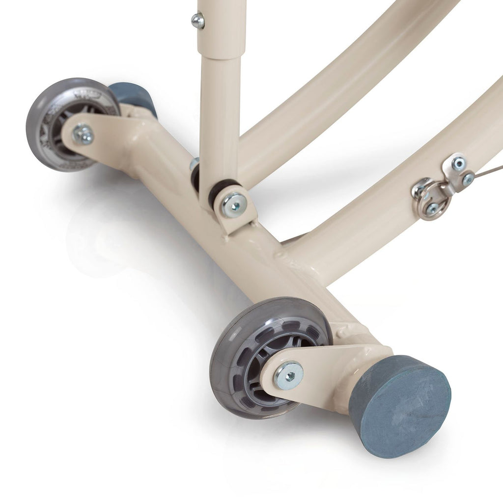 Je rolt de stoel gemakkelijk overal naartoe met de wieltjes onderaan het frame. Ook kun je de stoel meenemen met de meegeleverde schouderriem, met een gewicht van nog geen 10kg is dit prima te tillen. Behoefte aan meer bescherming tijdens transport? Bestel dan een losse draagtas bij het product!