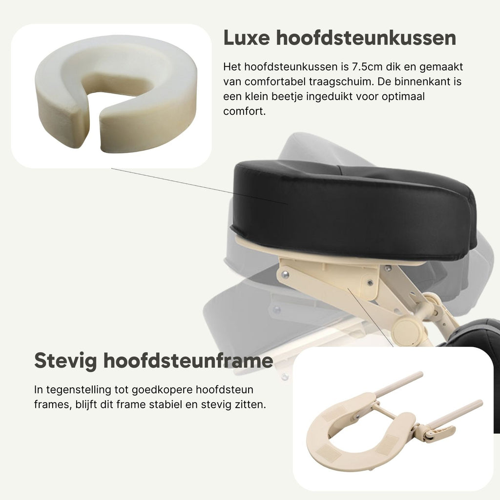 Een van de grootste complimenten die wij te horen krijgen over onze premium massagestoelen, is het comfortabele hoofdsteun kussentje dat aan de binnenkant een klein beetje is ingedeukt. Hierdoor past het zich aan aan de vorm van het gezicht van je cliënt, waardoor deze urenlang comfortabel kan blijven liggen op de massagestoel zonder last te krijgen van strepen in het gezicht.