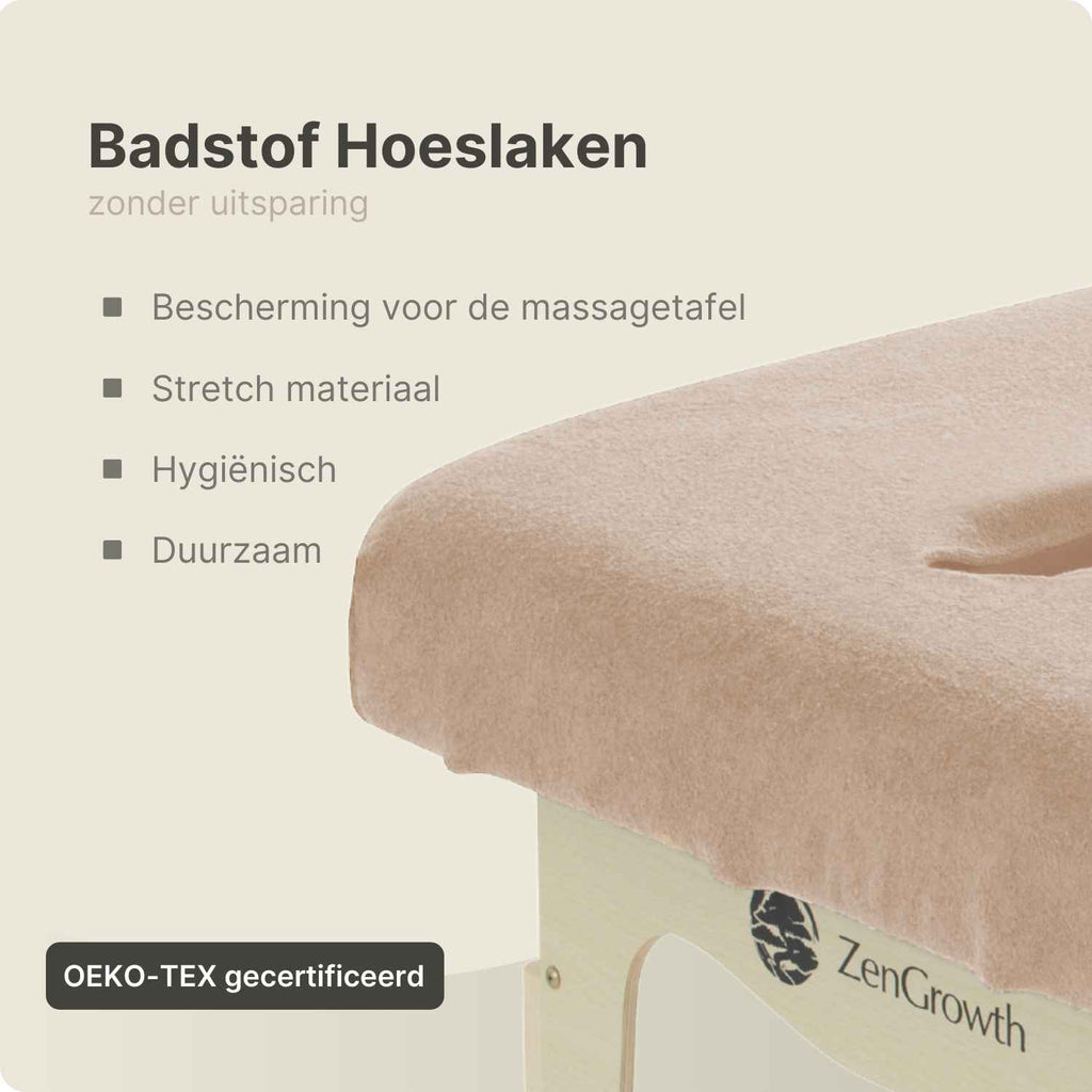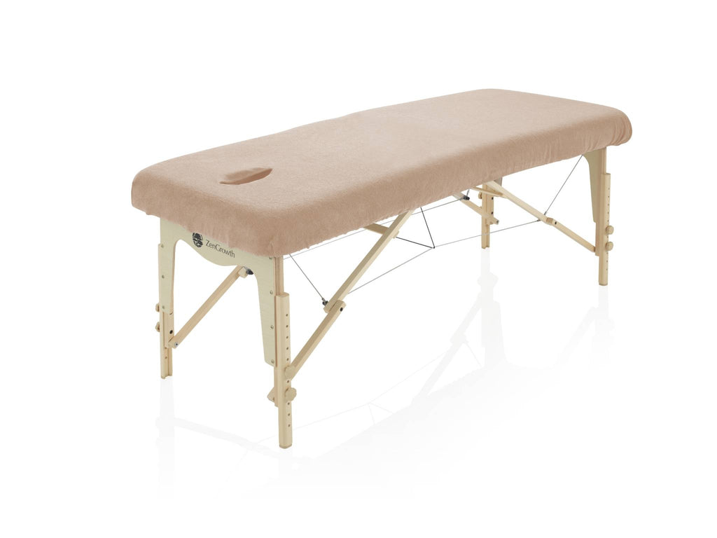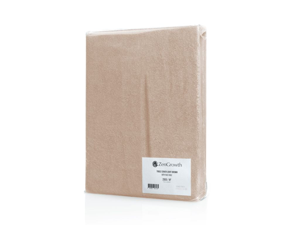 This light brown fitted sheet with a face hole is suitable for various massage tables, with a length between 180cm and 185cm and a width between 63cm and 71cm.