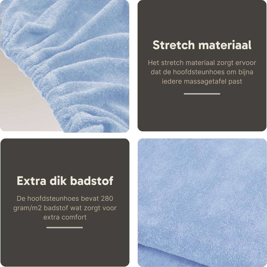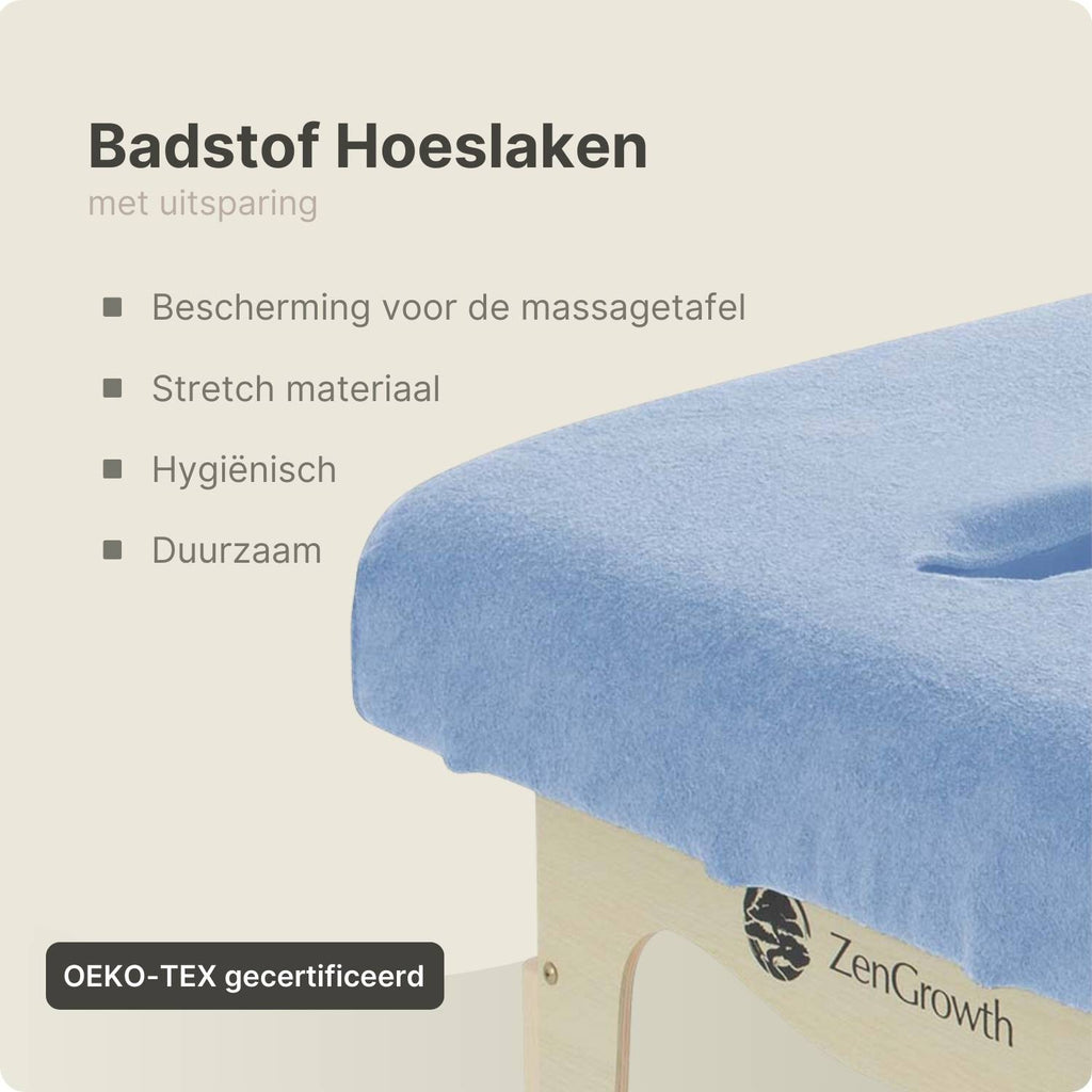This light blue fitted sheet with face cradle cutout is suitable for various massage tables, with a length between 180cm and 185cm and a width between 63cm and 71cm.