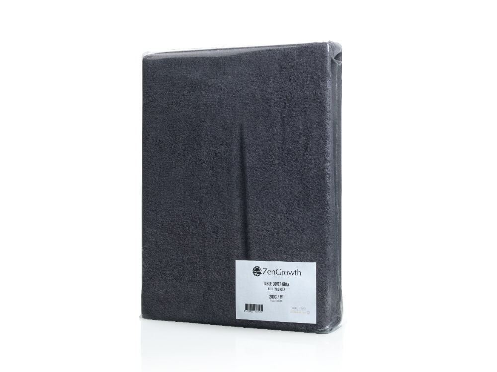 This grey fitted sheet with a face cradle opening is suitable for various massage tables with a length between 180cm and 185cm and a width between 63cm and 71cm, or 71cm and 80cm.
