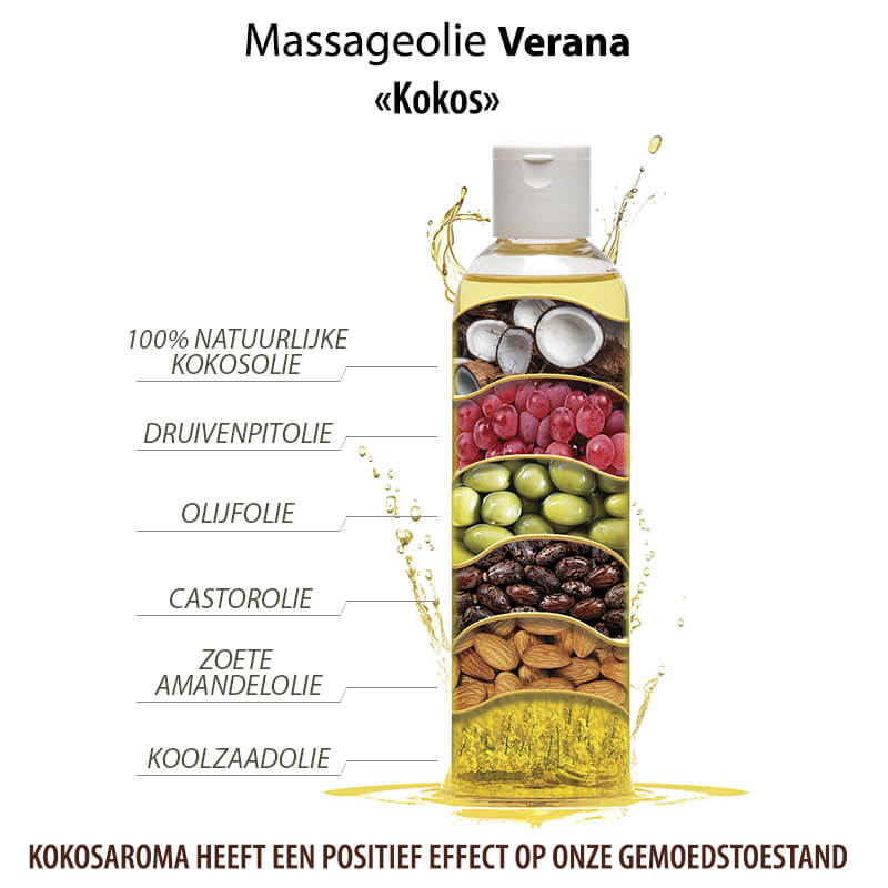Like all Verana massage oils, this one is made with a base of five natural oils: rapeseed, castor, olive, grape seed, and almond. This unique blend promotes skin rejuvenation, helps slow the ageing process, hydrates, has anti-inflammatory properties, increases skin elasticity, and improves overall skin health.