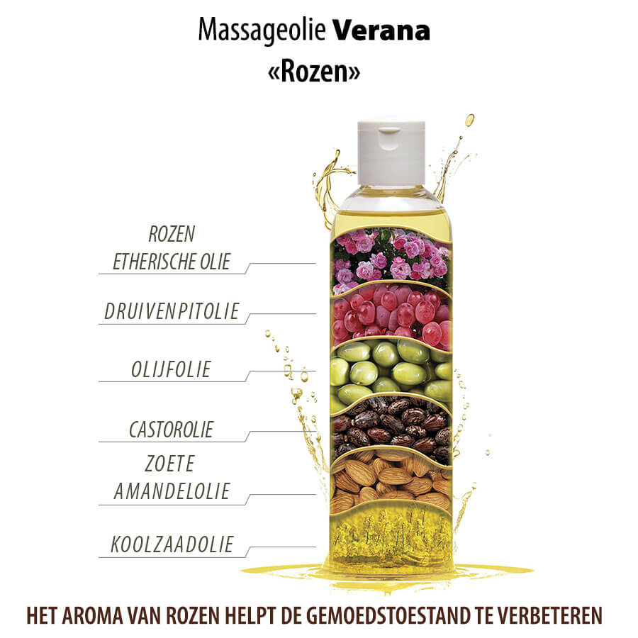 Like all Verana massage oils, this rose massage oil is based on a blend of five natural oils (rapeseed oil, castor oil, olive oil, grapeseed oil, and almond oil). This unique mix promotes skin rejuvenation, helps slow the ageing process, hydrates the skin, has anti-inflammatory properties, increases skin elasticity, and improves overall skin condition.