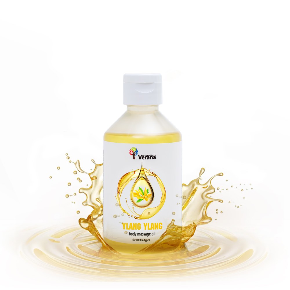 Like all Verana massage oils, this Ylang Ylang oil is made from a unique blend of five natural oils: canola oil, castor oil, olive oil, grape seed oil, and almond oil. This mix promotes skin rejuvenation, helps slow down the skin's ageing process, hydrates the skin, offers anti-inflammatory properties, increases skin elasticity, and improves overall skin condition.
