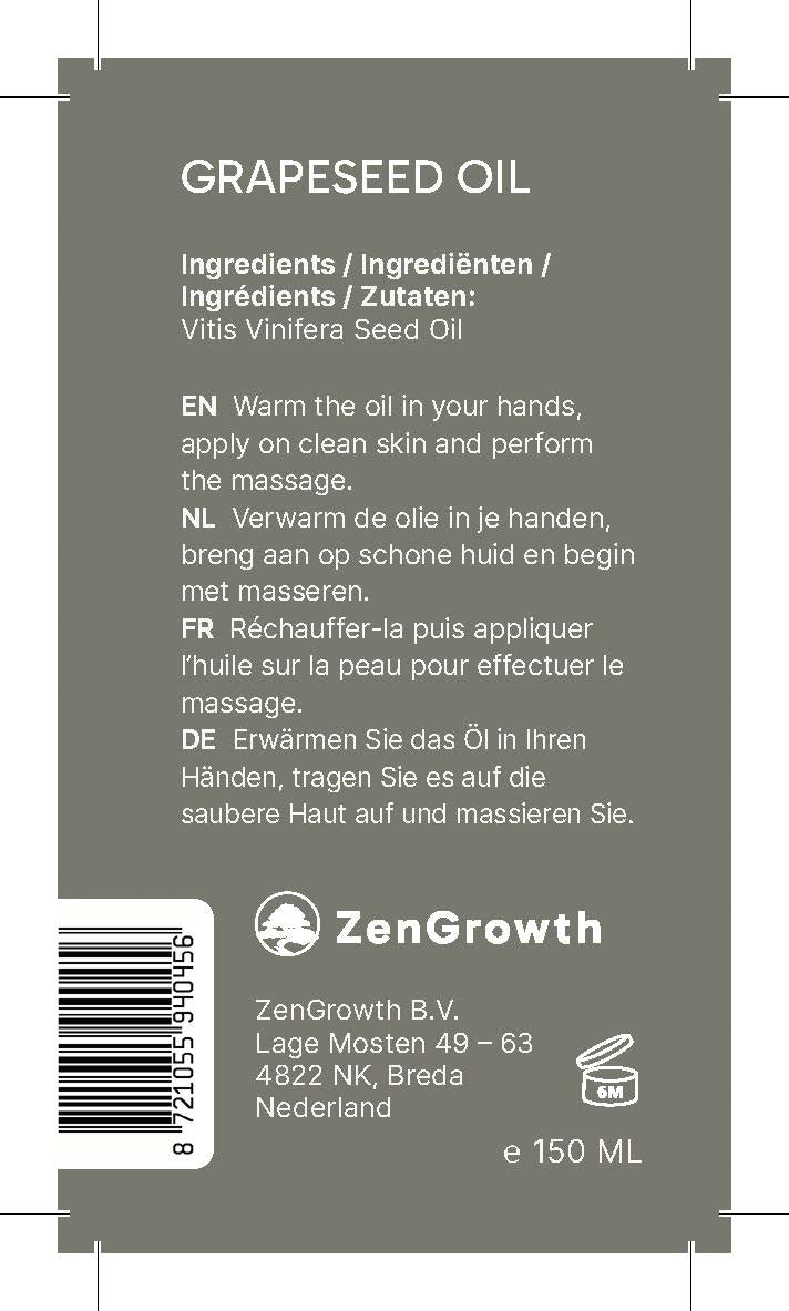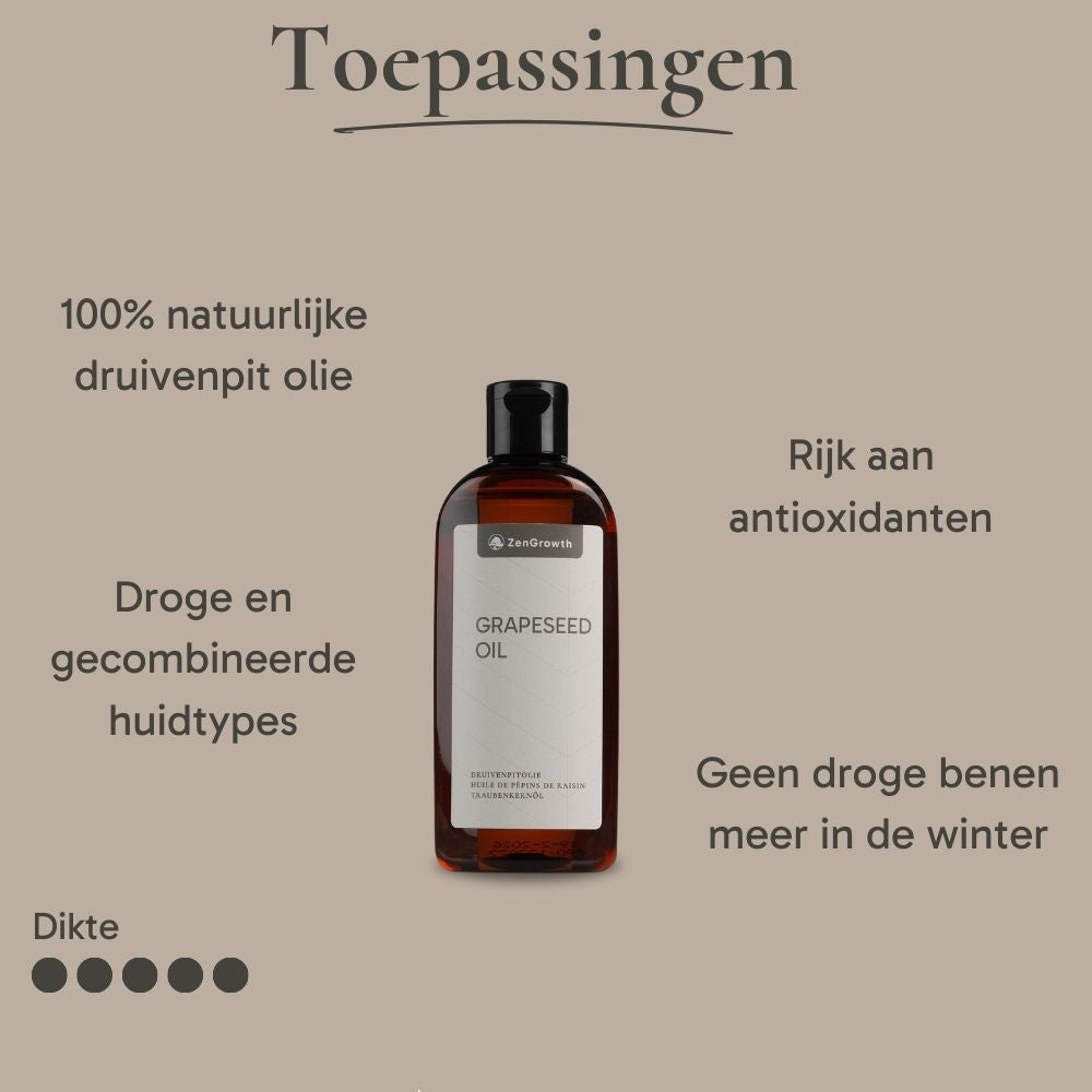 ZenGrowth grape seed oil is an odourless oil that helps with skin regeneration and replenishing the unsaturated fatty acids in the skin, giving your skin a radiant glow. Apply this oil to your skin for a silky-soft feel!