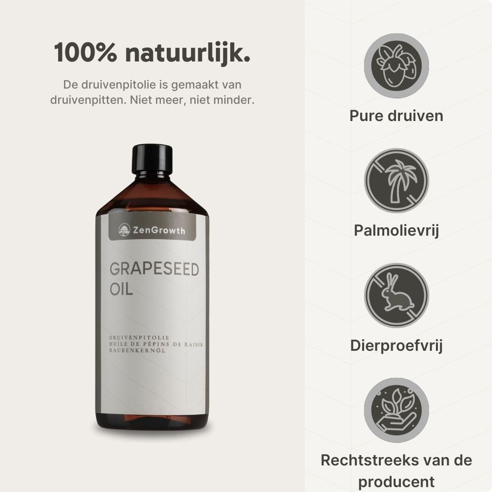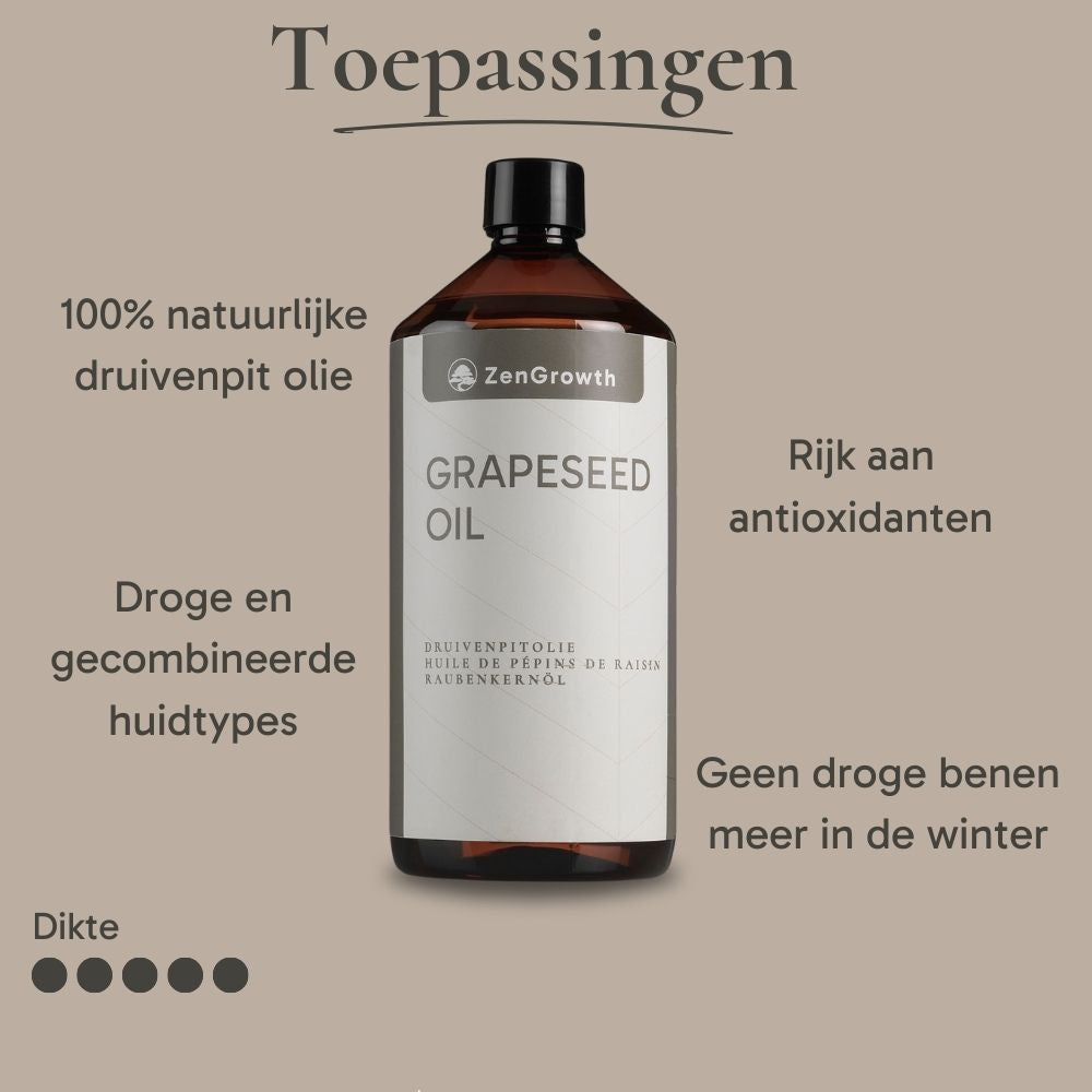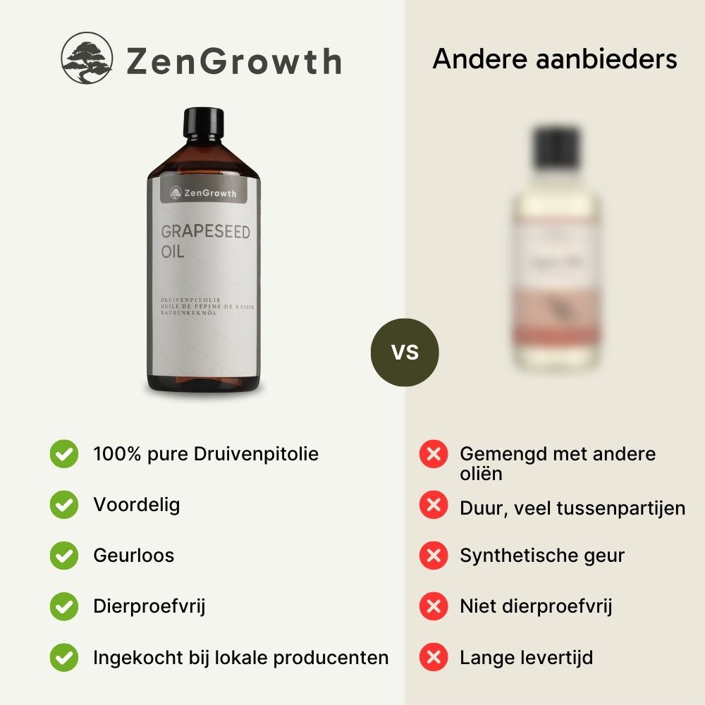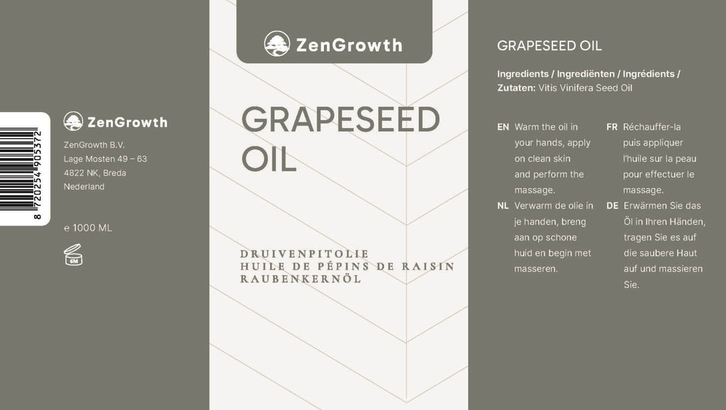 ZenGrowth grape seed oil is fragrance-free. It aids skin regeneration and replenishes the skin’s unsaturated fatty acids, leaving your skin radiant and silky smooth!