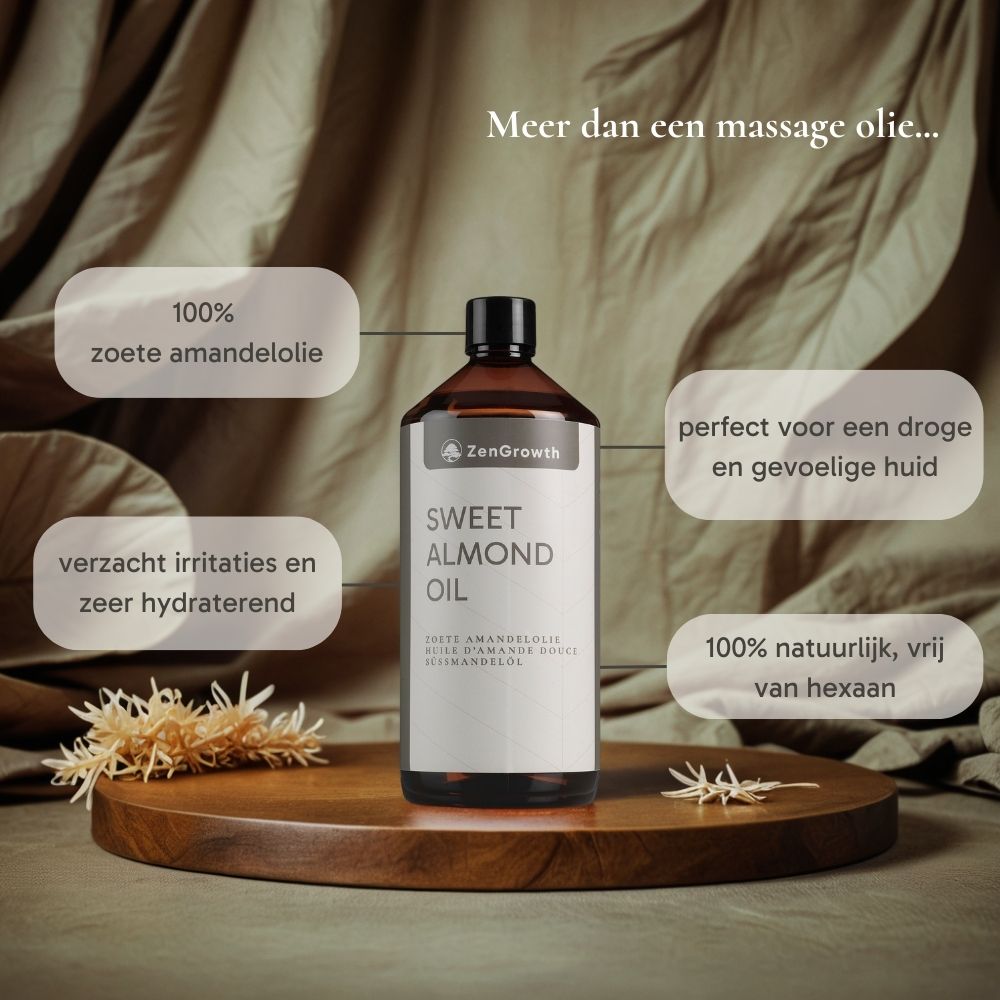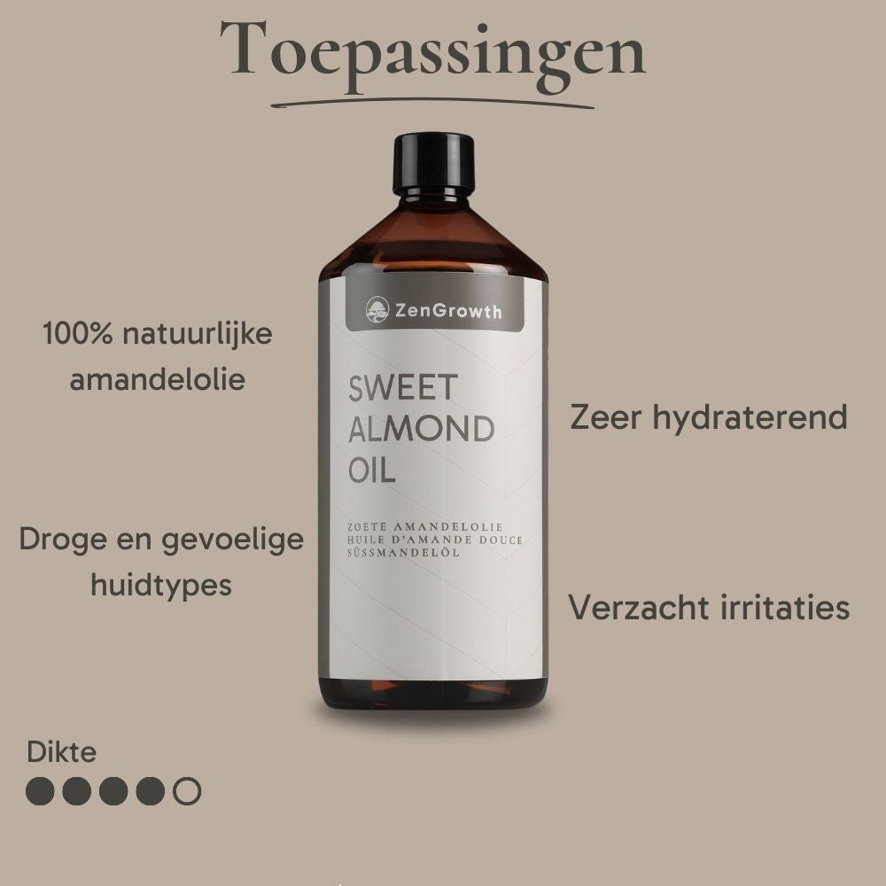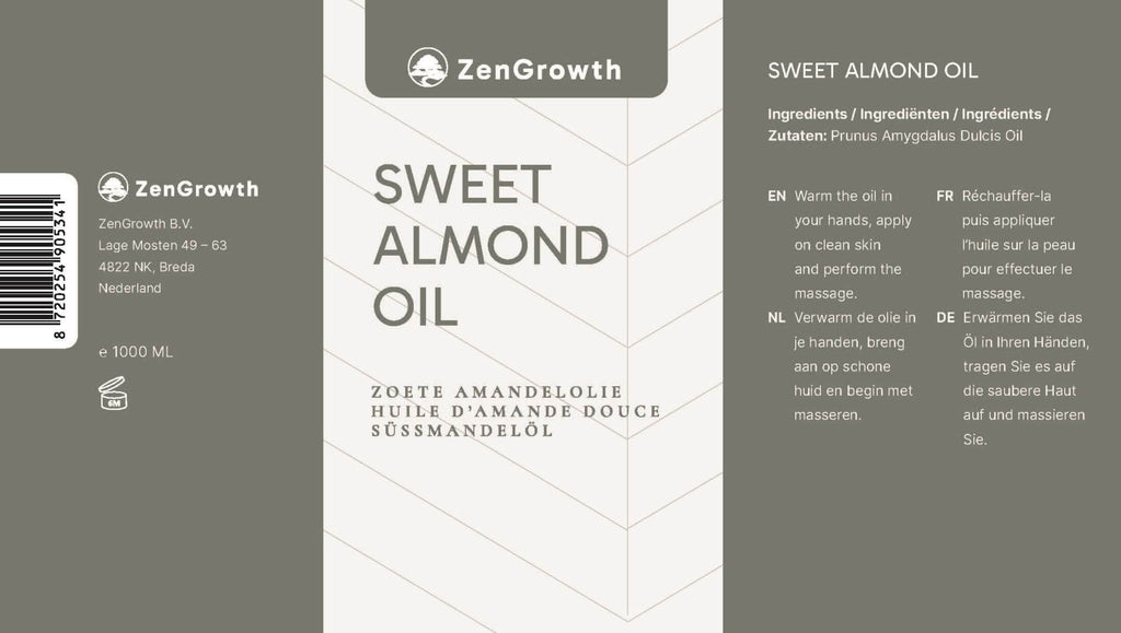 ZenGrowth sweet almond oil is fragrance-free and suitable for many skin types, especially dry skin. It is rich in vitamins A and E, helping to prevent skin ageing.