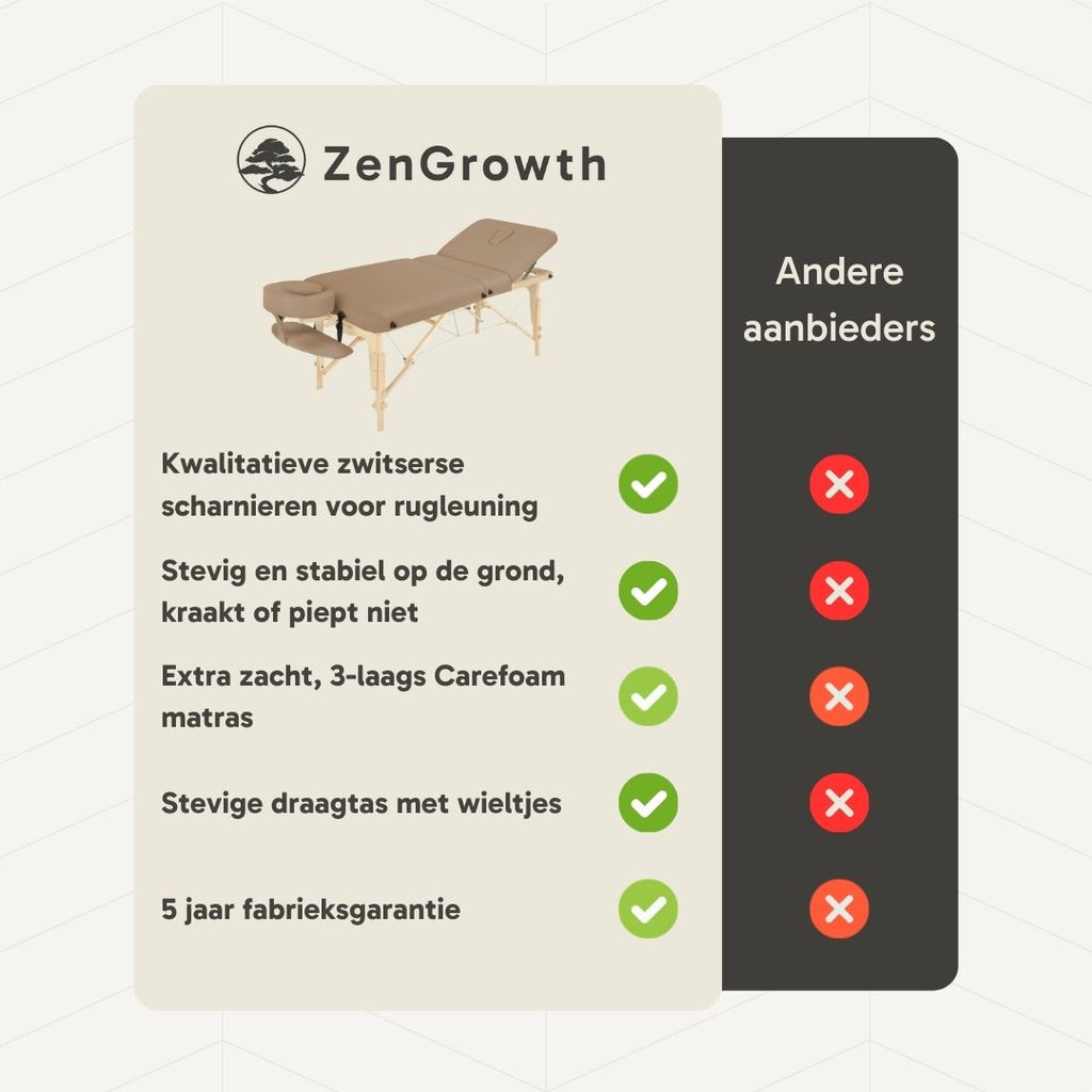 The ZenGrowth Nimman is a high-quality foldable massage table developed with meticulous attention. During the design process, we incorporated all feedback from our customers, resulting in an unparalleled quality massage table!