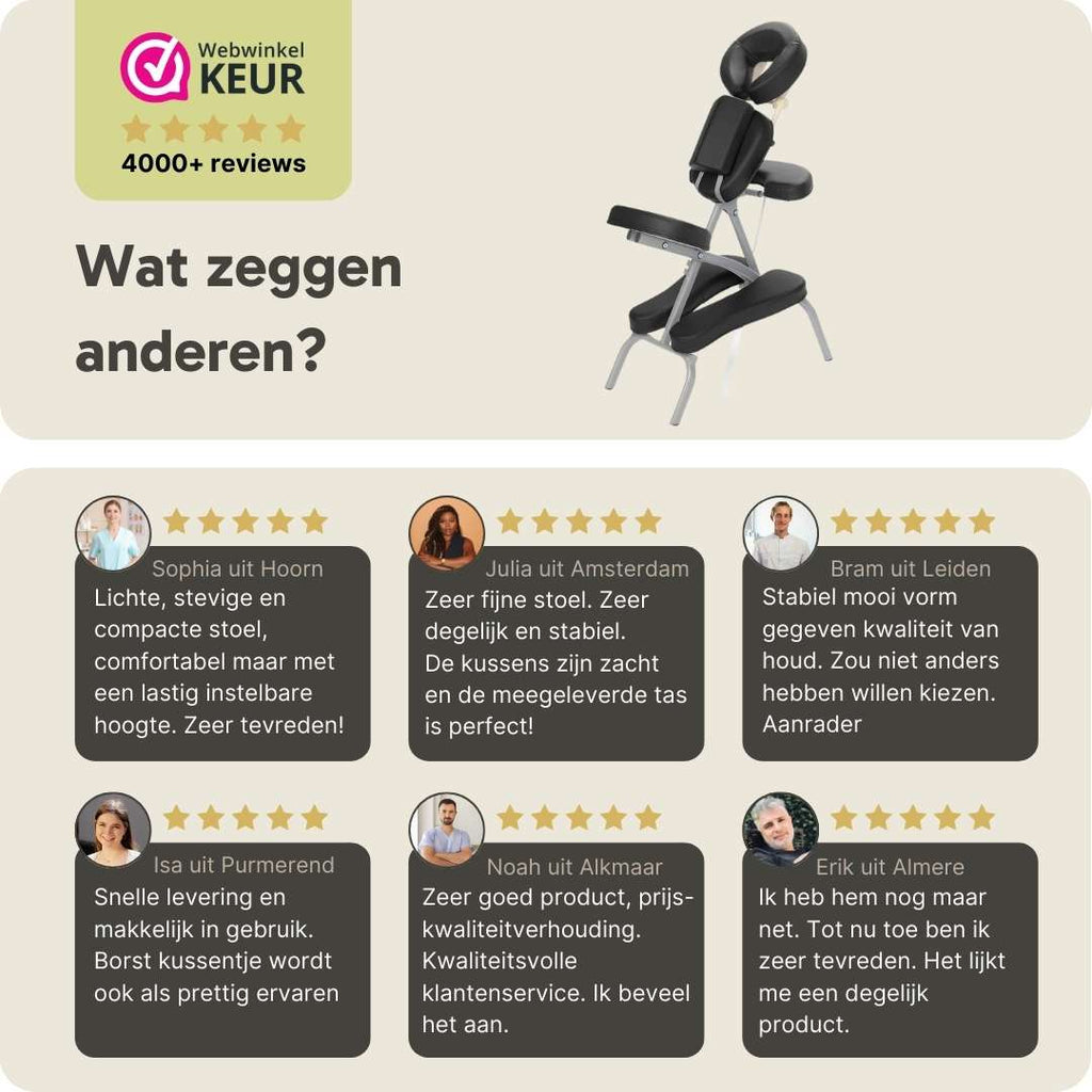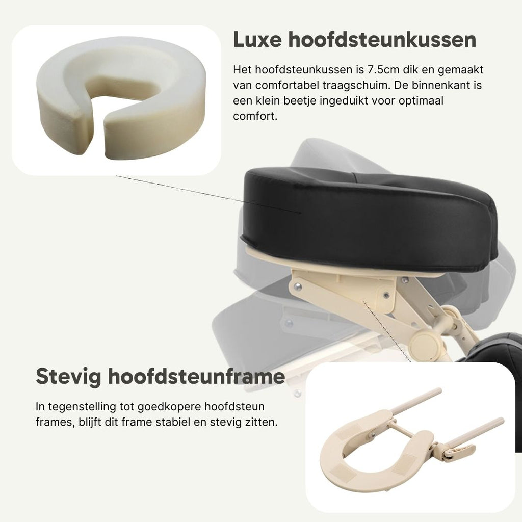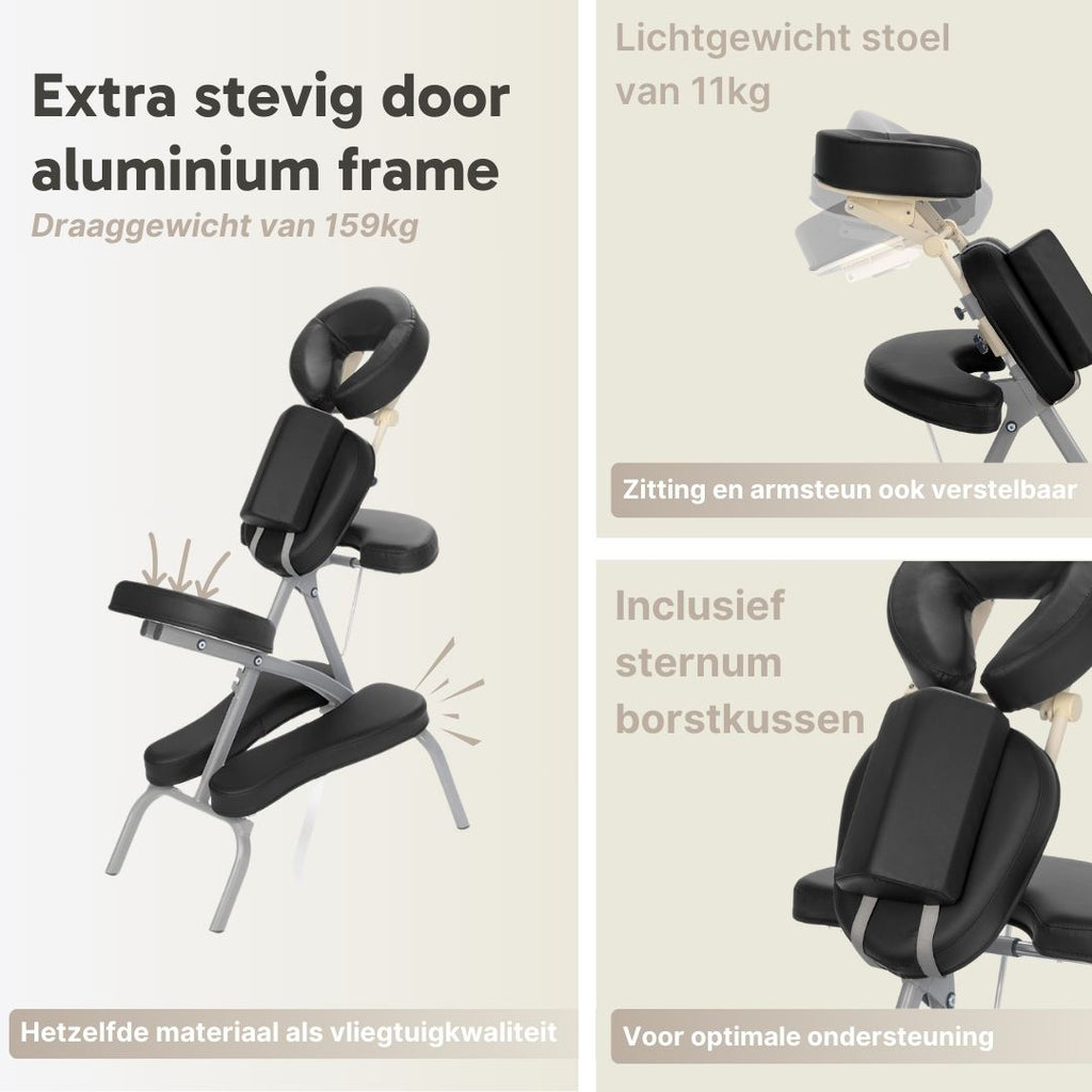 The massage chair sets up in seconds and has a load capacity of 160 kg. It remains stable and secure, even during intensive treatments. The ergonomic cushions and armrests are adjustable in four different ways for your client’s optimal comfort. Additionally, the chair includes an extra chest cushion for enhanced support.