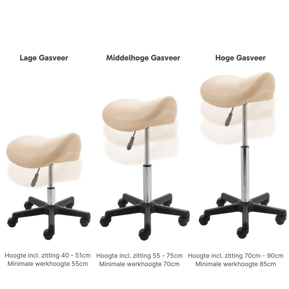 Depending on your preferred seating or working height, we offer various gas springs. For example, if you work at a low table, the low gas spring is ideal. If you work at a high (massage) table, the high gas spring is the perfect choice. This ensures you always achieve the correct working height.