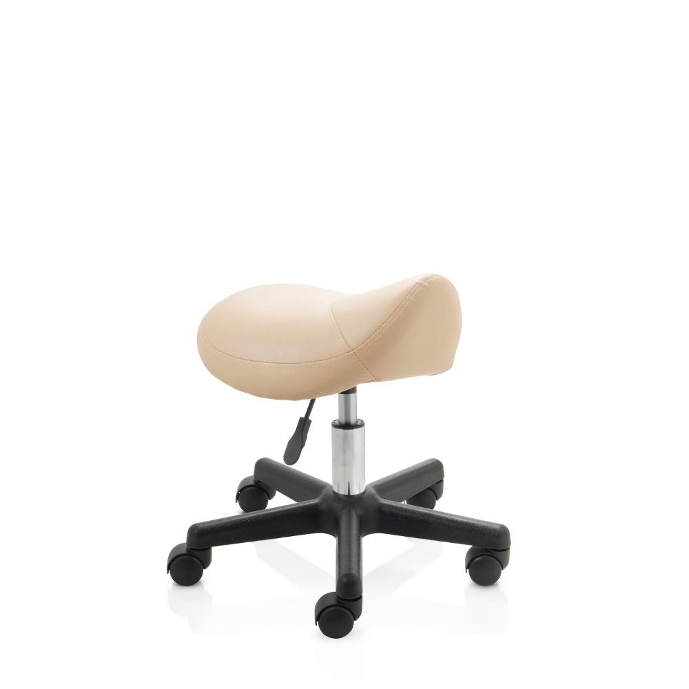 A saddle stool helps prevent back pain by promoting a natural, active sitting posture. By slightly tilting forward, the spine remains in a healthy S-shape, reducing strain on the lower back. Additionally, the open seating angle improves blood circulation and prevents slouching, which is especially beneficial for professions requiring prolonged sitting.