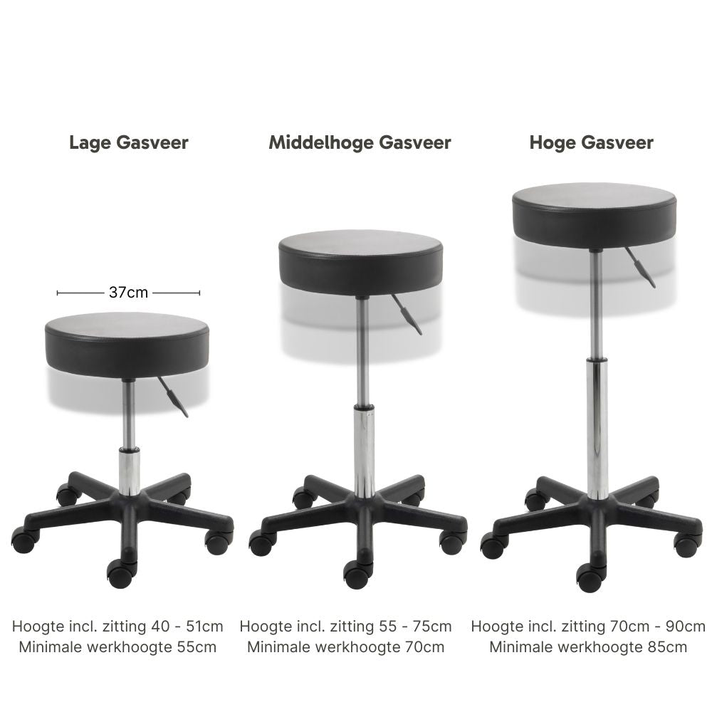 Depending on your desired sitting or working height, we offer various gas springs. For instance, if you work at a low table, the low gas spring is ideal. For higher (massage) tables, the high gas spring is the perfect solution. This ensures you always have the optimal working height.