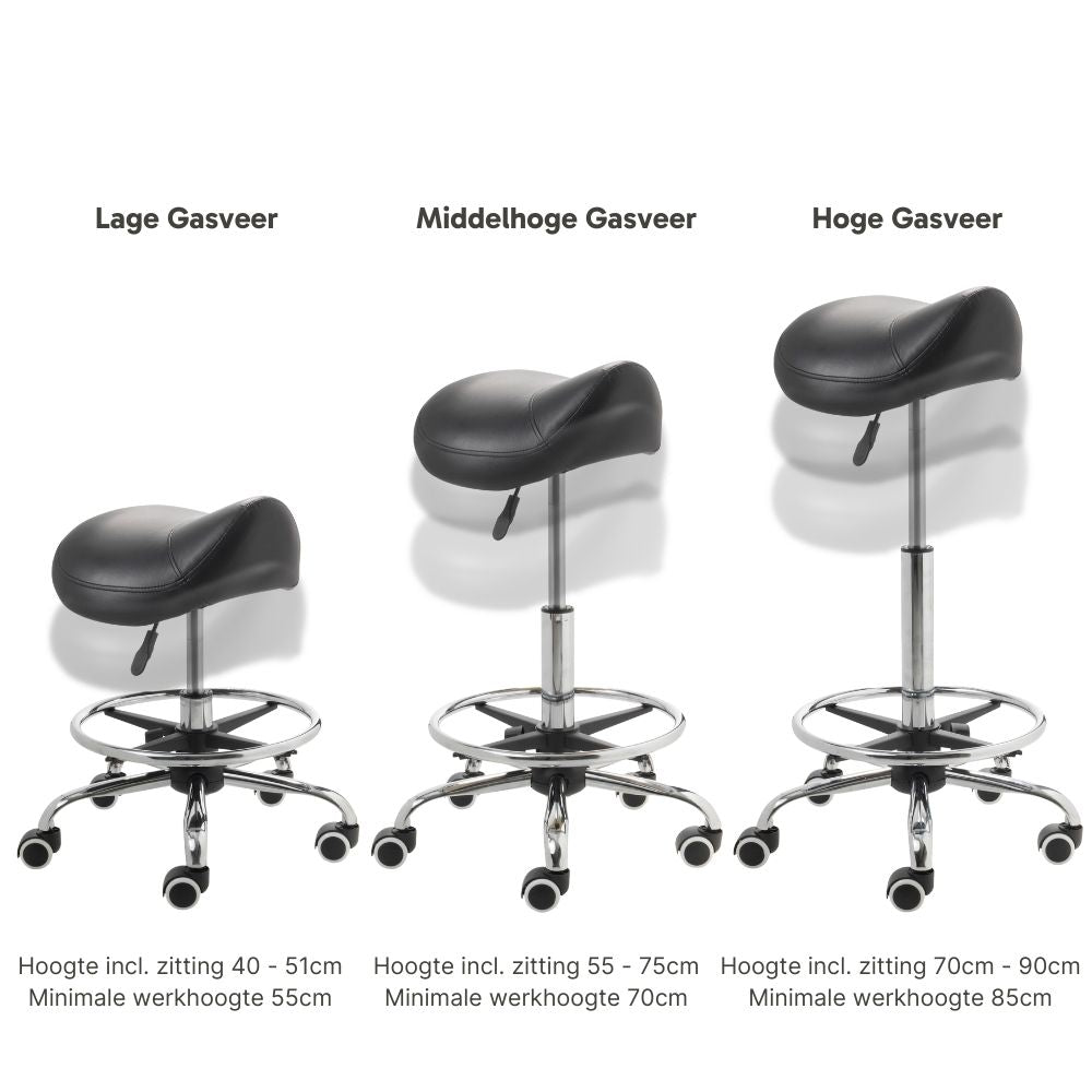 Depending on your desired seat height / working height, we have different gas springs. For example, do you work at a low table? Then the low gas spring is ideal! However, do you work at a high (massage) table? Then the high gas spring is ideal. That way you know for sure that you always choose the right working height.